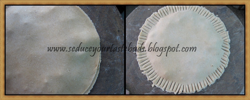 9.Pinch out 2 small balls of dough and roll each one as thinly as possible into circles.[ Both should be equal in circumference.Use a plate to mark the paratha and cut out to equal circles]